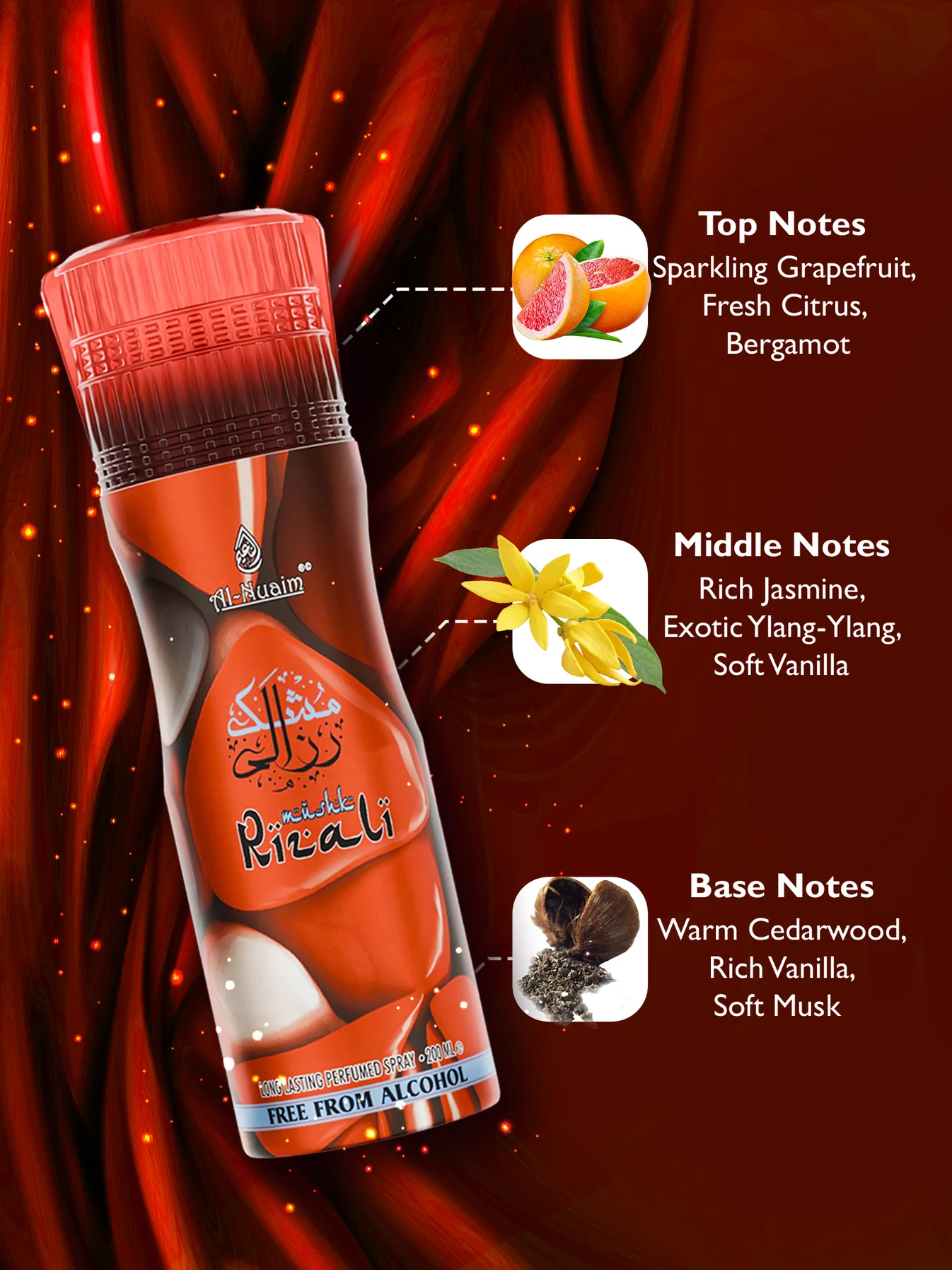 Mushk Rizali 200ML by Al-Nuaim is a refined and refreshing fragrance that beautifully blends citrus brightness with floral elegance and musky warmth. It opens with invigorating bergamot, fresh citrus, and sparkling grapefruit, creating a lively and uplifting introduction. The heart unfolds into rich jasmine and exotic ylang-ylang softened with smooth vanilla, adding depth and sophistication. As it settles, warm musk, earthy patchouli, and subtle cedarwood form a long-lasting, balanced finish that feels graceful, confident, and perfect for everyday wear.