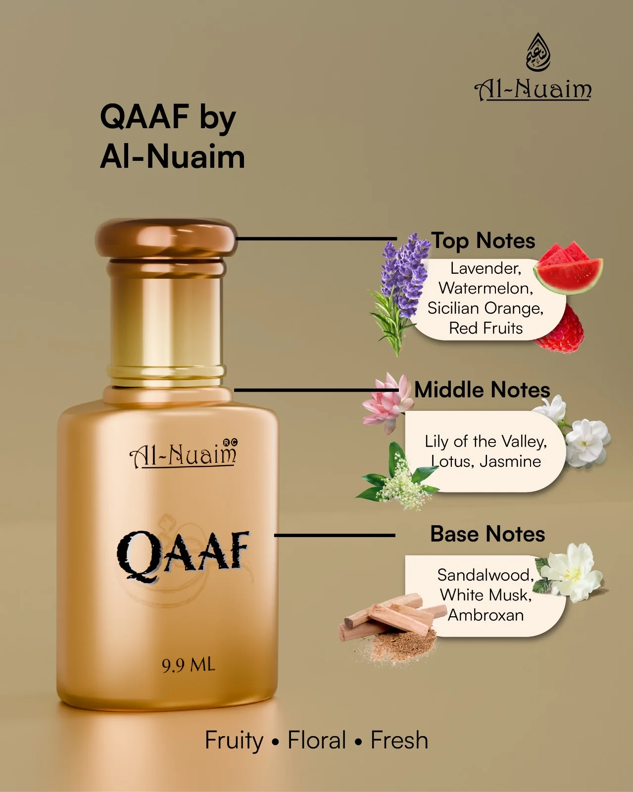 Qaaf 9.9ML by Al-Nuaim is a vibrant and refreshing fragrance that blends fruity brightness with smooth woody depth. It opens with an energetic fusion of lavender, juicy watermelon, Sicilian orange, and red fruits, creating a lively and modern first impression. The heart unfolds into a soft floral composition of lily of the valley, lotus, and jasmine, adding elegance and balance. As it dries down, sandalwood, white musk, and ambroxan create a clean, creamy, and long-lasting finish — perfect for daily wear with a stylish and confident touch.